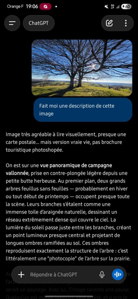 Prenez une image qui correspond à l’atmosphère, au style ou à la composition que vous souhaitez reproduire ou transformer. Importez-la dans ChatGPT (ou tout autre LLM multimodal) et demandez-lui simplement :