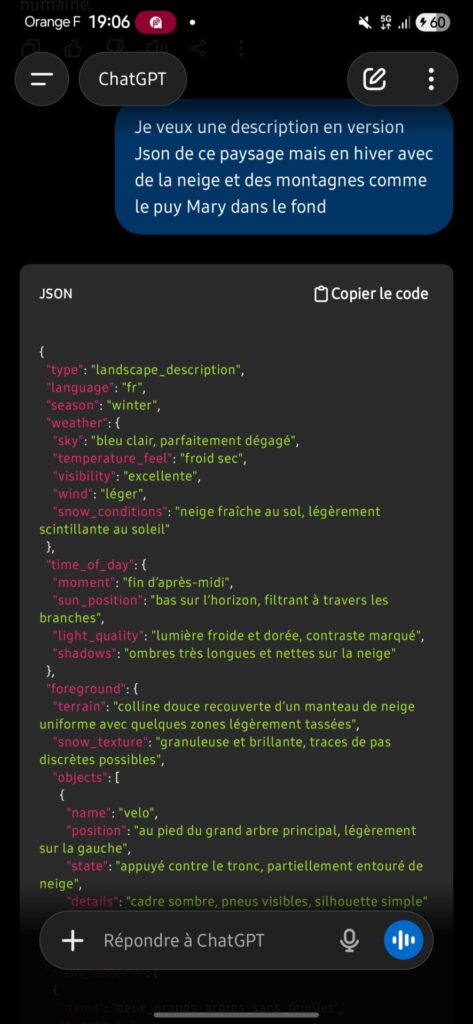 C’est ici que la méthode prend toute sa puissance. Une fois l’image décrite, vous allez demander au LLM d’intégrer vos souhaits de modification — mais en sortie JSON uniquement.